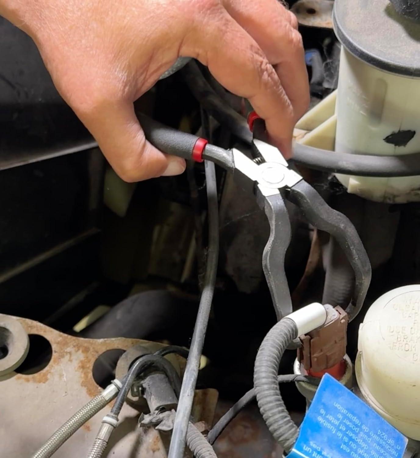 Angled Tips for Easier Access to Hard-to- Reach Connectors. Removes Many Single and Double Connectors Found on Many Cars, Trucks and Heavy-Duty Vehicles. Narrow knurled tips provide extra grip when removing connector in tight spaces. May also work on fuel lines, EVAP lines and DEF fittings with tabs that must be depressed to disengage. The tool is 7″ long and made from forged carbon steel for extra strength and durability. Spring in the handle for one handed use. Dual material grips for comfort.