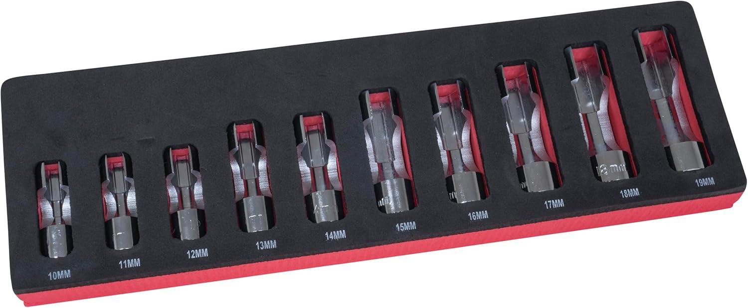 Set includes: 10mm, 11mm, 12mm, 13mm, 14mm, 15mm, 16mm, 17mm, 18mm and 19mm.