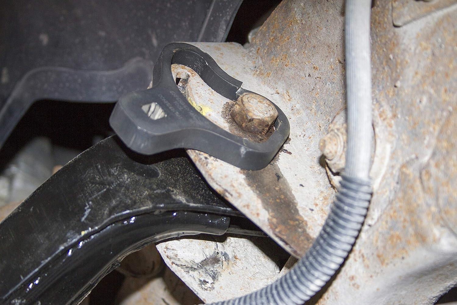 The 14-1/2″ 21mm wrench can be used from bottom side of vehicle to move hard-to-reach and often rusty OEM cams on 2007 and newer GM vehicles with coil spring front suspensions.