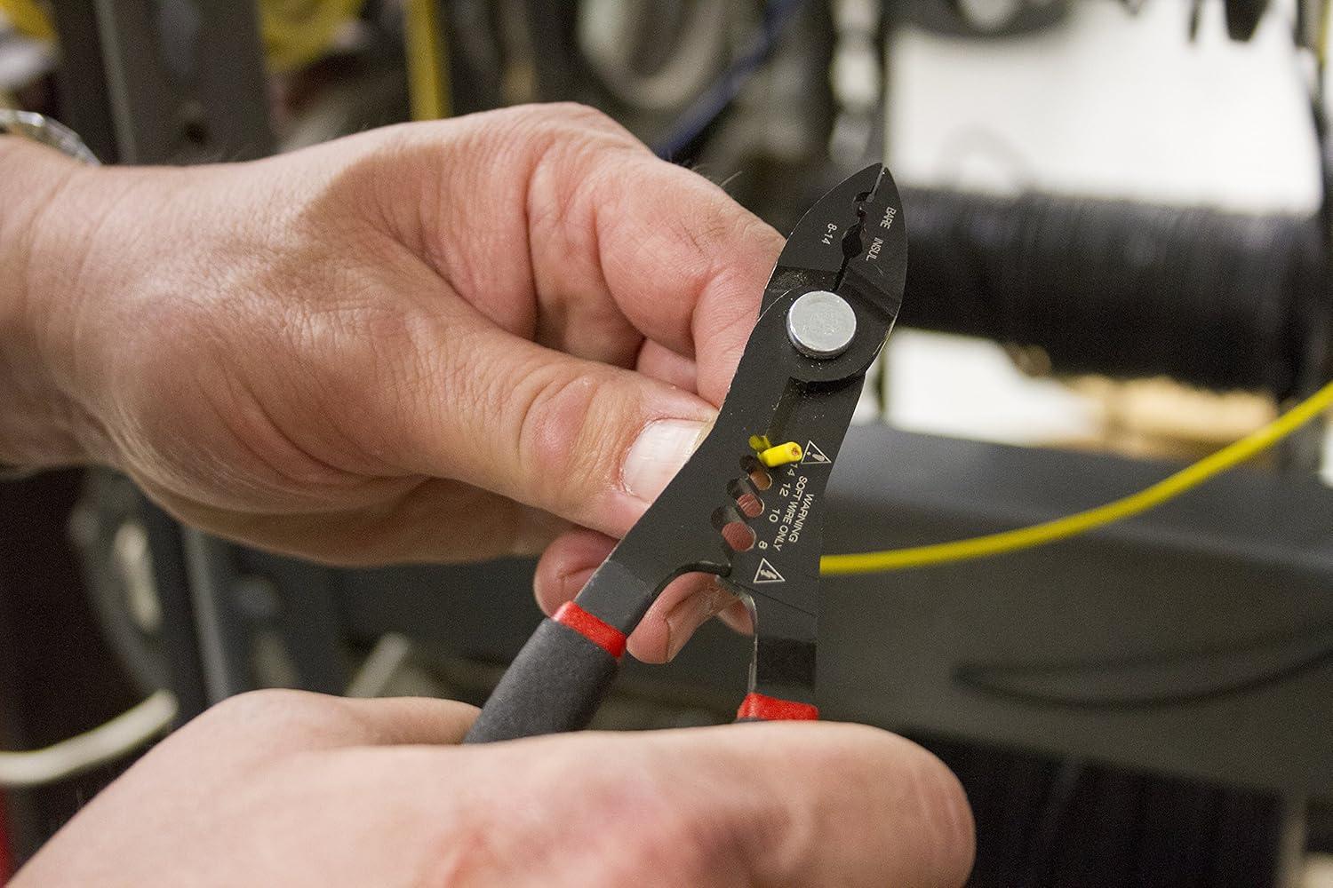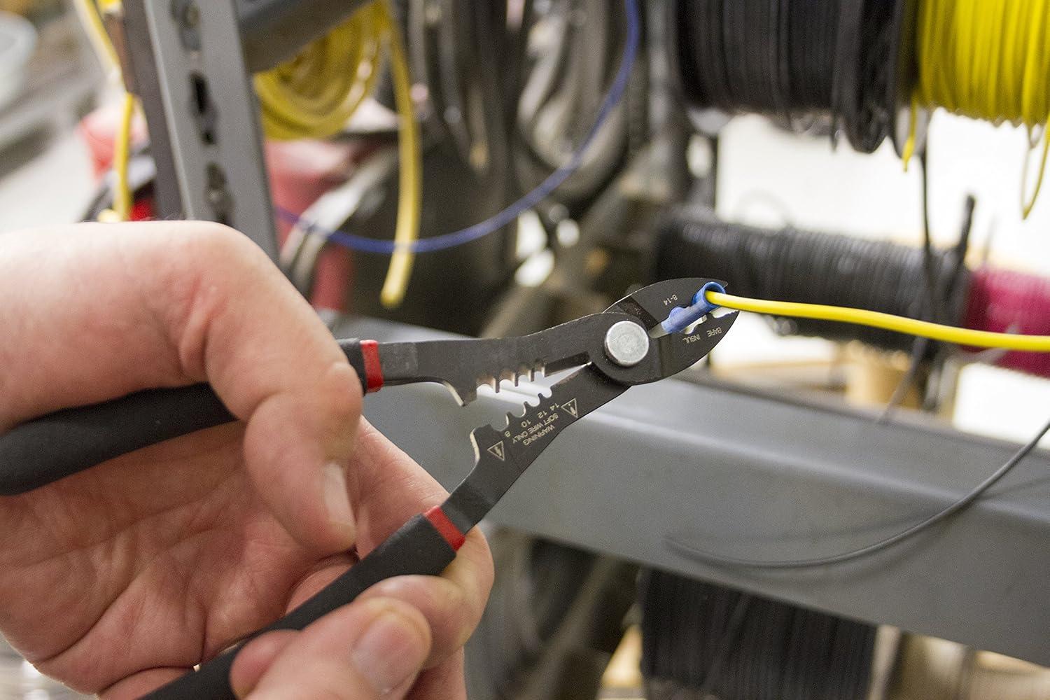 Cuts and Strips Insulation from 8 to 14 Gauge Wires. Crimps 8 to 14 gauge insulated and non-insulated terminals. The pliers end grabs wire for twisting and holding. A convenient wire gauge key is marked on the tool.