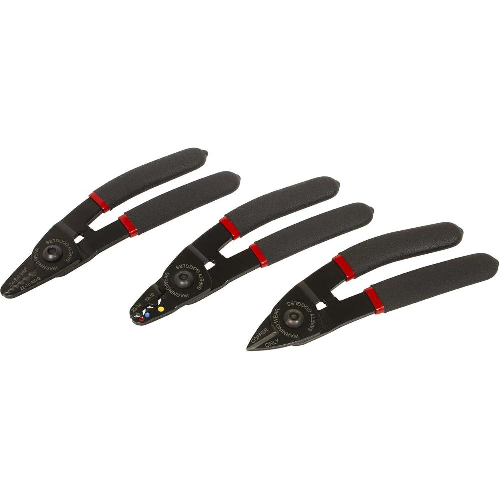 Three piece mini electrical pliers are ideal for cutting, crimping, and stripping wire in tight places including behind engines, behind seats, and under dashes.